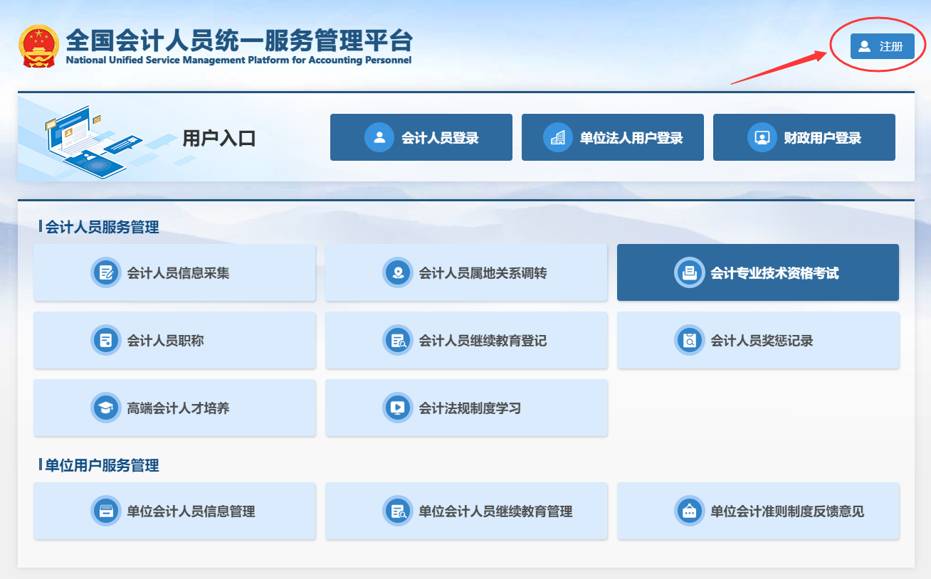 报考人员应在规定时间内,访问全国会计人员统一服务管理平台报名系统进行报名,首次访问需点击右上角“注册”按钮,按提示信息注册。