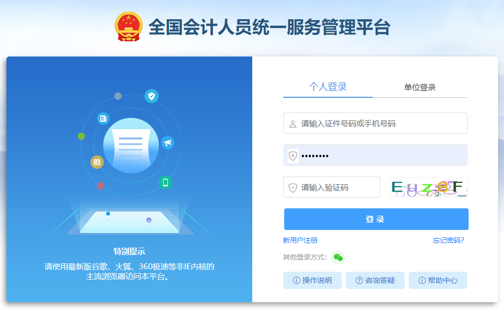 注册成功后,即可登录全国会计人员统一服务管理平台: